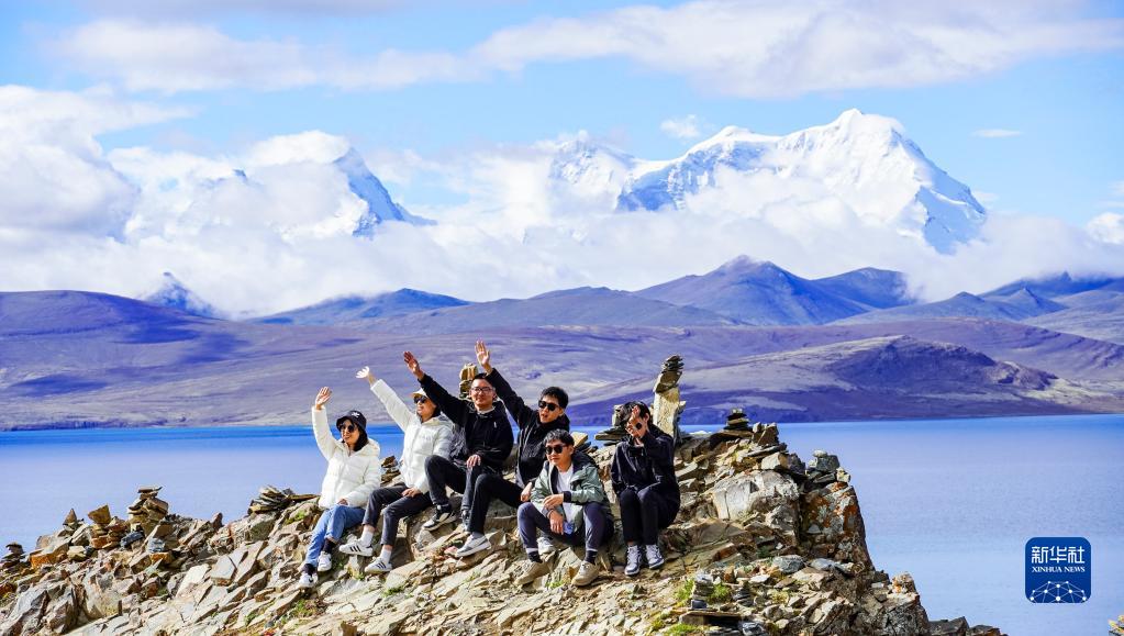 7月4日,游客在普莫雍錯湖邊拍照留念。