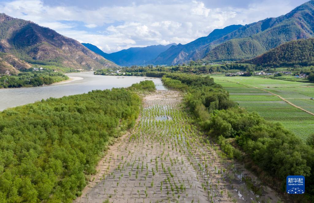 這是6月20日在麗江市石鼓鎮拍攝的金沙江邊的柳林,中間部分為新栽種柳樹(無人機照片)。多年來,云南省麗江市石鼓鎮林業工作者帶領群眾在江邊種下10萬余株柳苗。如今江畔柳林郁郁蔥蔥,成為一道防風固沙的天然屏障,有效減少了汛期江水對農田的侵蝕。