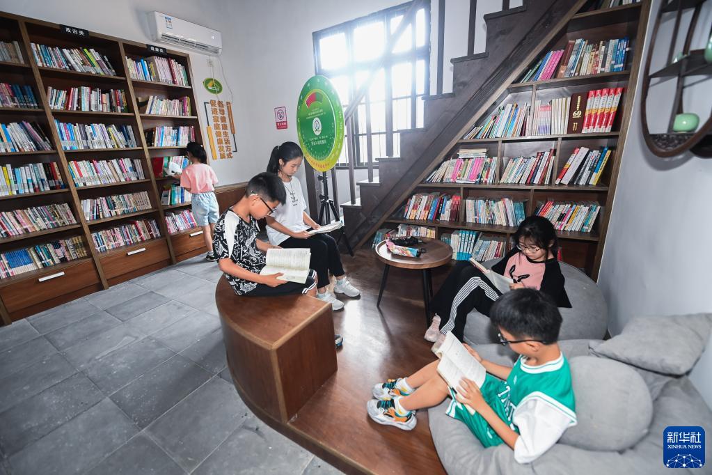 7月5日,孩子們在織里鎮伍浦村文化禮堂內的圖書室看書。