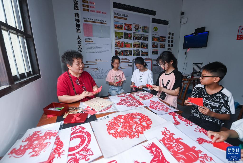 7月5日,剪紙老師在伍浦村文化禮堂內(nèi)的暑期公益課堂教孩子們剪紙技藝。