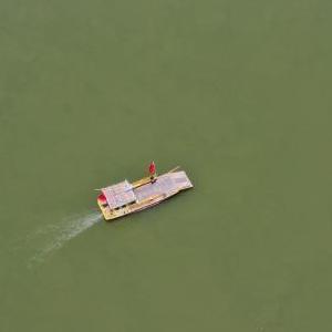 7月4日,在廣西來賓市興賓區遷江鎮大力村,李曼榮在清水河上擺渡(無人機照片)。