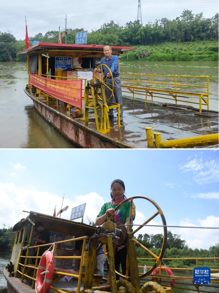 拼版照片:上圖為2022年5月11日拍攝的在廣西來賓市興賓區遷江鎮大力村清水河上,李曼榮的公公巫云飛生前在駕駛渡船(陸益丹攝);下圖為在廣西來賓市興賓區遷江鎮大力村清水河上,李曼榮在駕駛渡船(新華社記者陸波岸2023年7月4日攝)。
