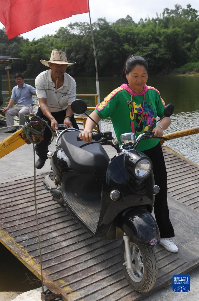 7月4日,在廣西來賓市興賓區遷江鎮大力村清水河上,李曼榮(前)幫鄉親推車下船。