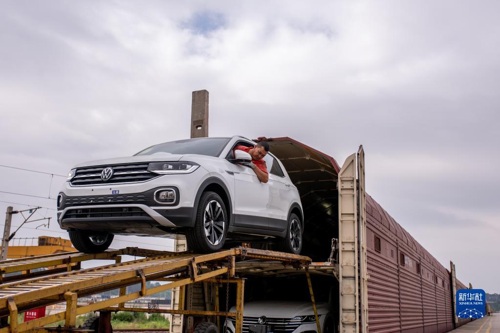 7月5日,工作人員在云南桃花村鐵路商品汽車物流基地駕駛商品車駛出火車車廂。
