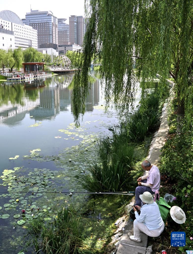 7月5日,市民在亮馬河畔垂釣。