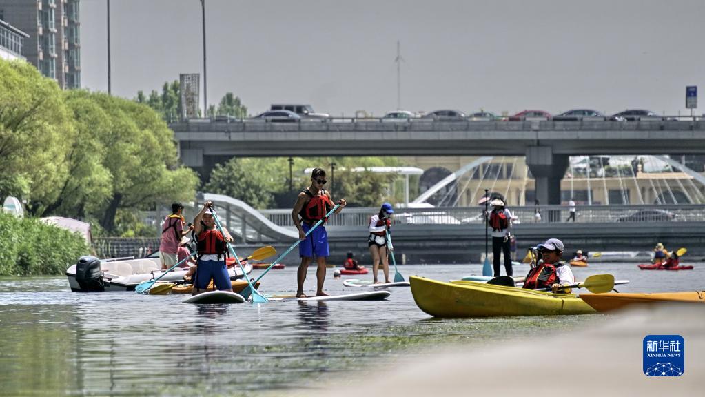 7月5日,市民在亮馬河上參加水上運動。