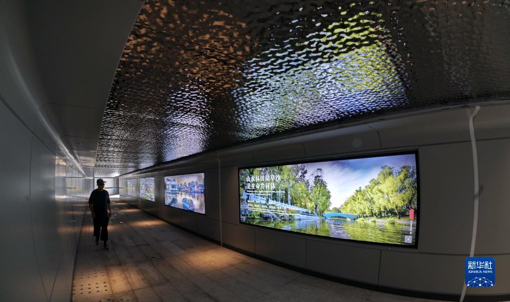 新建成的展示城市文化歷史的亮馬河燕莎橋濱水通道(7月5日攝)。