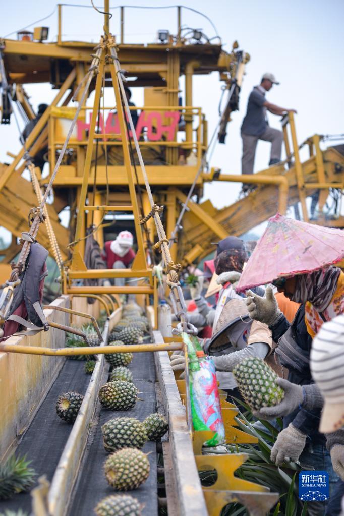 7月5日,在印度尼西亞楠榜省德邦易勿剎縣一處菠蘿種植園,人們在采摘菠蘿。