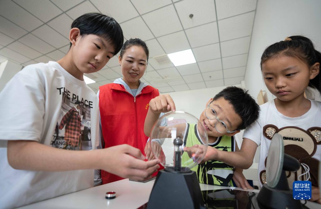 7月6日,在黃驊市海濱學院社區“多彩暑期·向陽花開”公益課堂,志愿者指導孩子操作科普小儀器。