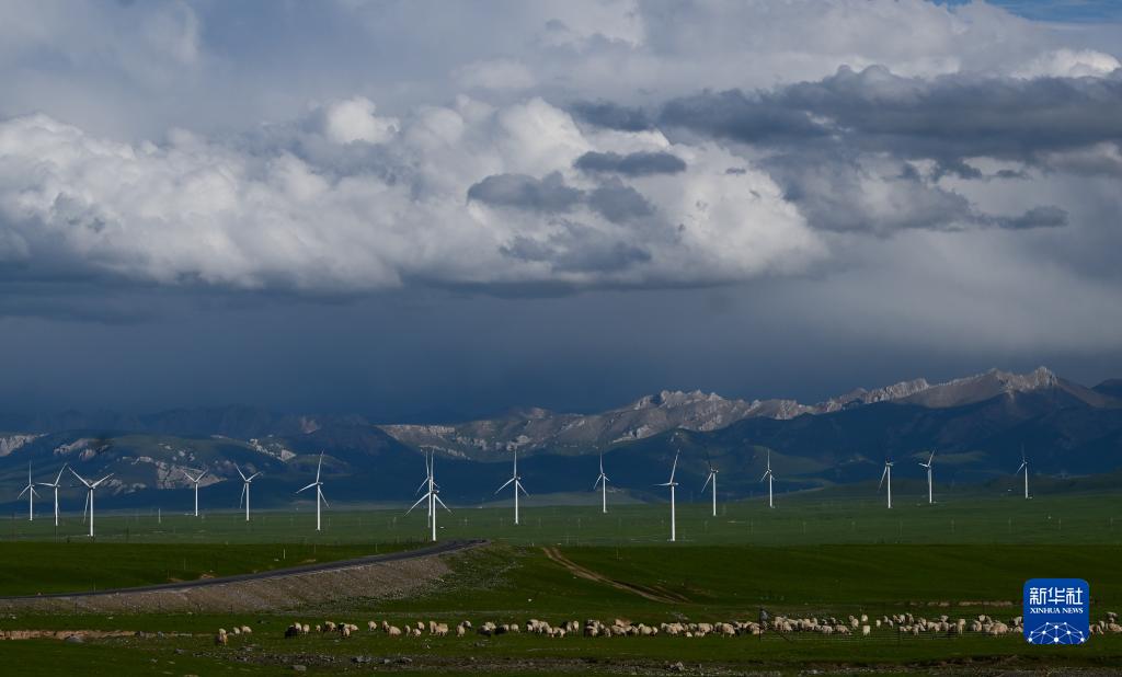 7月5日,羊群在天峻草原的一處風電場附近漫步、吃草。