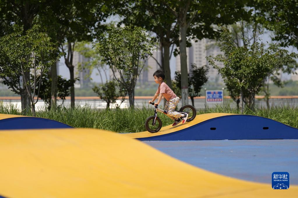 7月7日,小朋友在河北省遷安市灤河沿岸一個(gè)親子游樂場游玩。