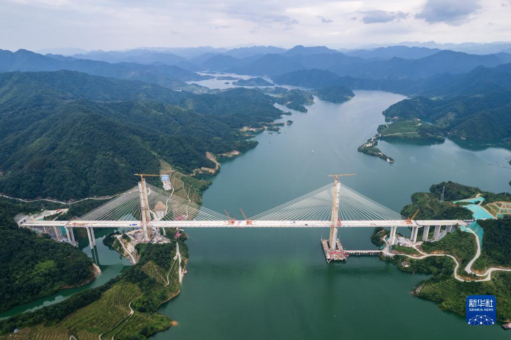 這是7月7日在湖南省益陽市安化縣拍攝的官新高速雪峰湖大橋施工現場(無人機照片)。