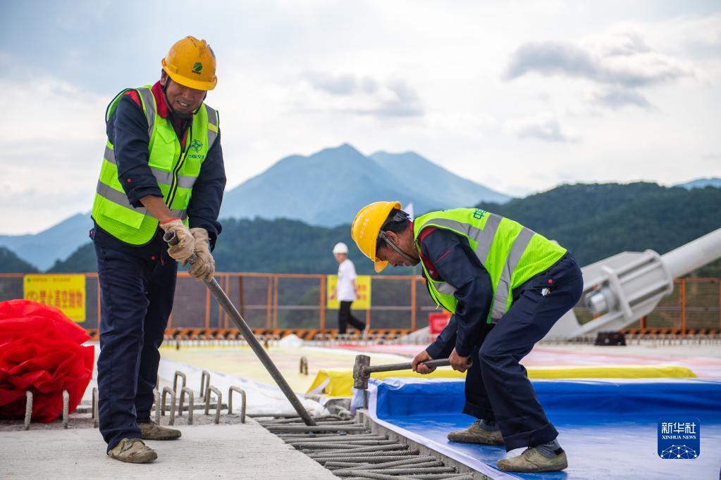 7月7日,在官新高速雪峰湖大橋施工現場,工人在進行橋面合龍施工。