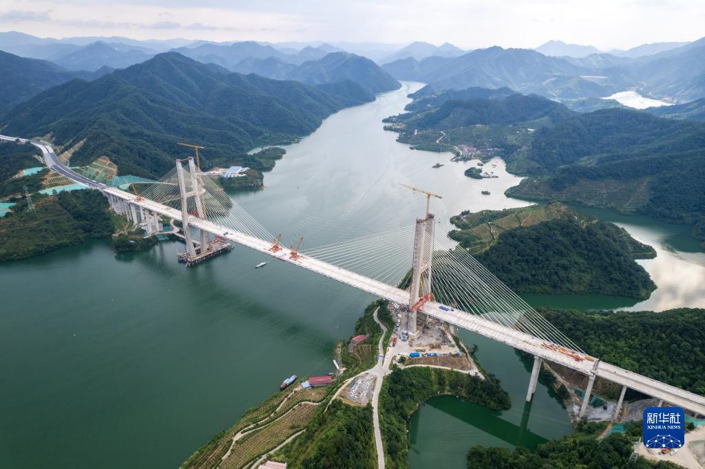 這是7月7日在湖南省益陽市安化縣拍攝的官新高速雪峰湖大橋施工現場(無人機照片)。