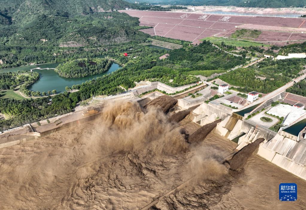 這是7月7日拍攝的黃河小浪底水庫排沙出庫場景(無人機照片)。