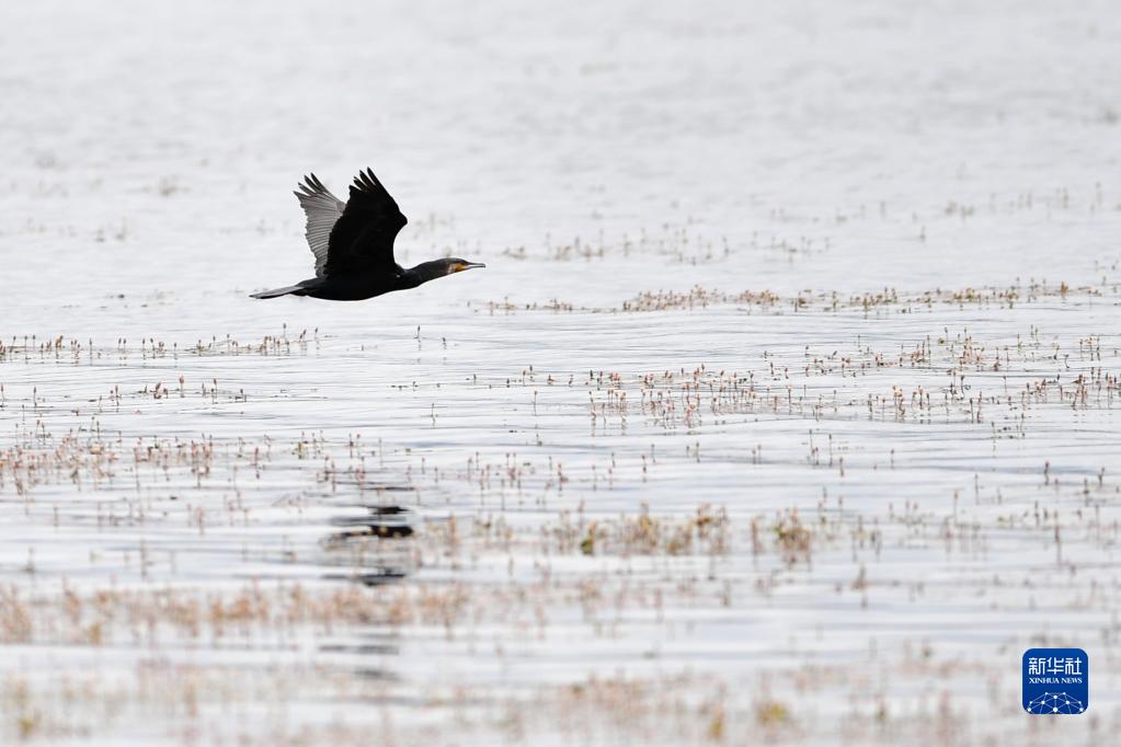 一只鸕鶿在尕海濕地上飛翔(7月7日攝)。