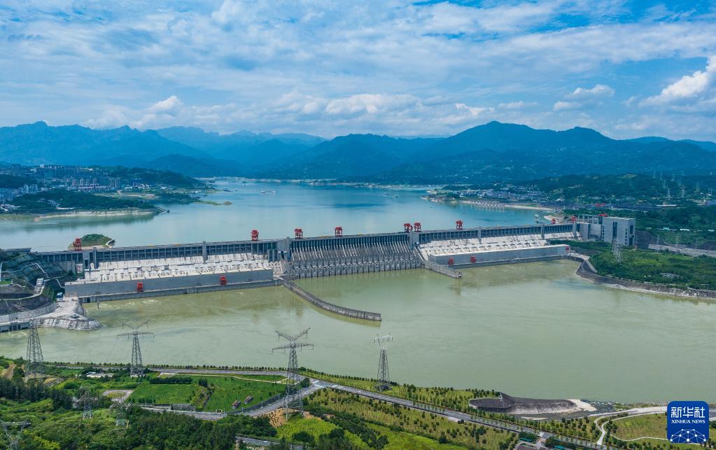 7月10日在湖北省宜昌市拍攝的長江三峽水利樞紐工程和右岸外送輸電線路(無人機照片)。