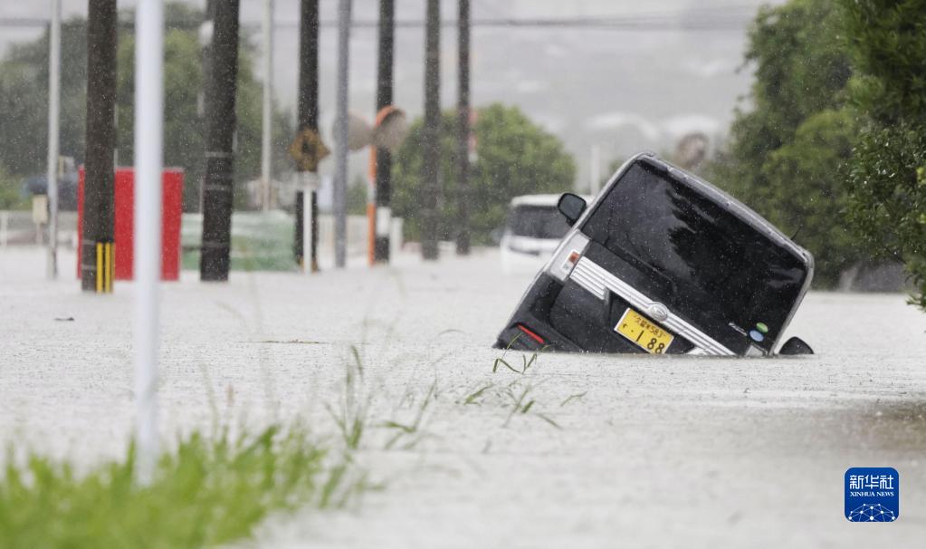 這是7月10日在日本福岡縣久留米市拍攝的被大雨圍困的汽車。