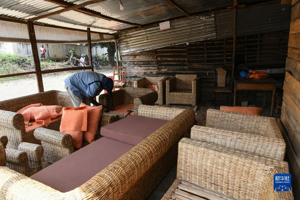 這是6月21日在布隆迪經(jīng)濟(jì)首都布瓊布拉拍攝的卡蒙蓋手工業(yè)培訓(xùn)中心青年培訓(xùn)項(xiàng)目結(jié)業(yè)學(xué)員恩達(dá)伊施米耶·塞萊馬尼開設(shè)的竹藤產(chǎn)品商鋪。