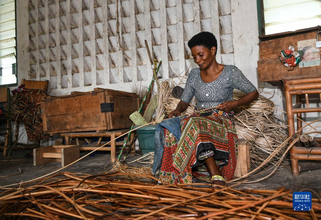 6月21日,在位于布隆迪經(jīng)濟(jì)首都布瓊布拉的卡蒙蓋手工業(yè)培訓(xùn)中心,學(xué)員在生產(chǎn)車間制作藤編產(chǎn)品。