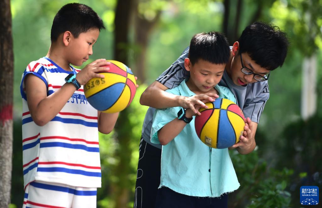7月10日,在河北滄州,志愿者周義帛(右一)教建設大街社區的孩子打籃球。