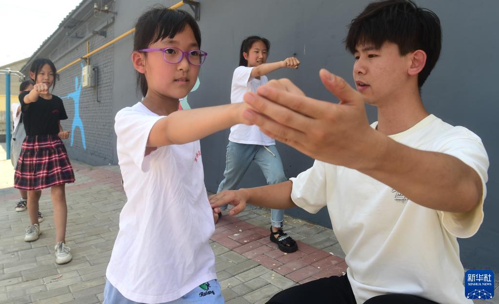 7月10日,在河北滄州,志愿者張翔宇為董林村學(xué)生傳授武術(shù)。