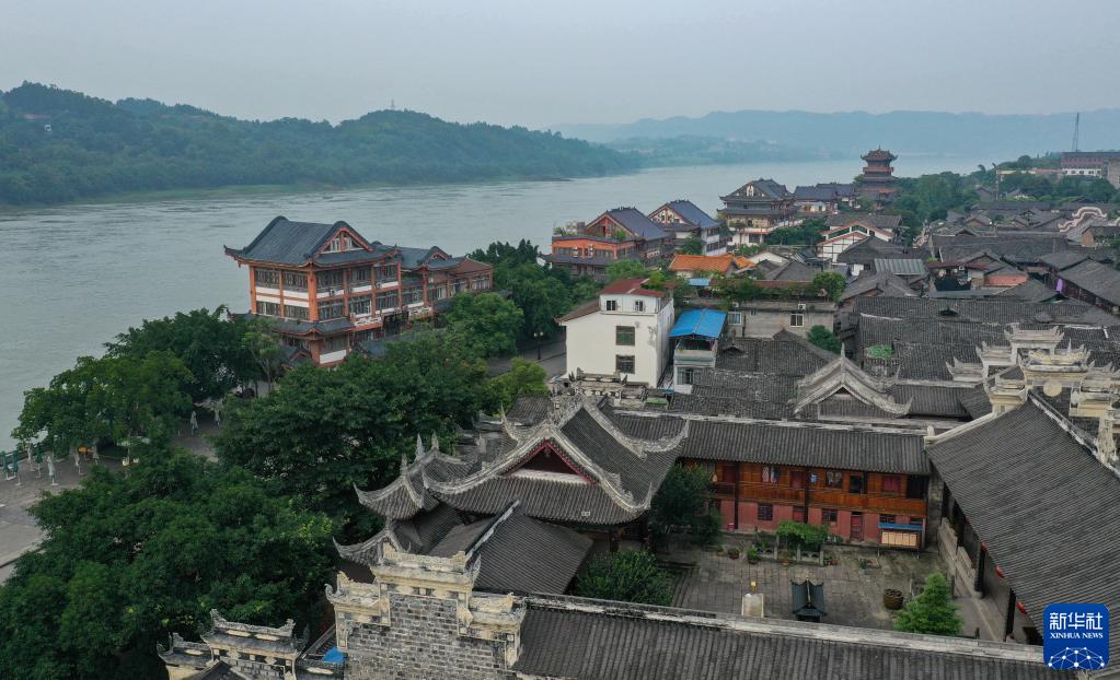 這是2022年6月22日在四川省宜賓市長江邊拍攝的李莊古鎮(無人機照片)。