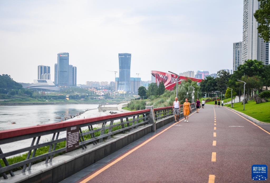 人們在四川省宜賓市三江口長江邊的綠道上散步(6月28日攝)。