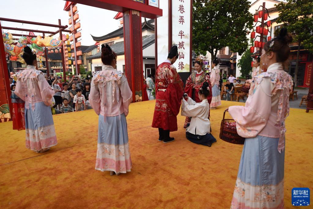 7月9日在江蘇東臺西溪天仙緣景區拍攝的民俗婚禮表演。