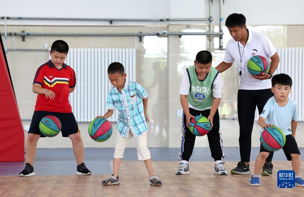 7月10日,在河北省石家莊市復興大街小學,小學生在老師的指導下練習籃球基本功。