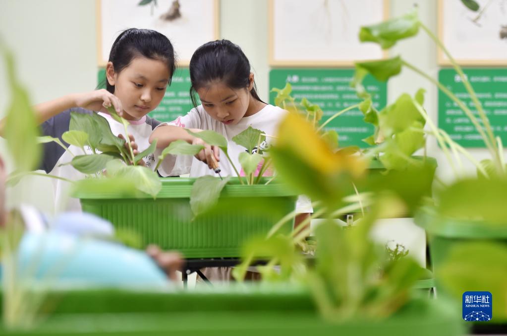 7月10日,在石家莊市興國小學,學生體驗中草藥種植。