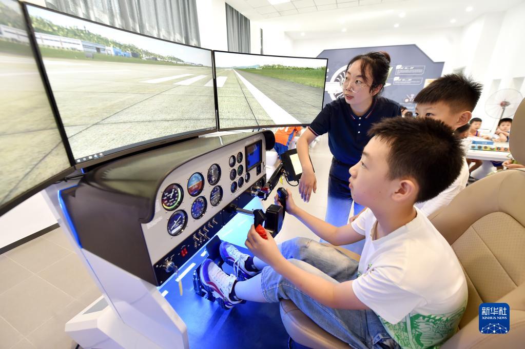 7月10日,在石家莊市融創(chuàng)中心第一小學(xué),學(xué)生在老師的指導(dǎo)下進(jìn)行飛行模擬駕駛。