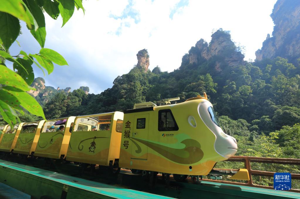 7月10日,游客乘觀光電車在張家界國家森林公園十里畫廊游覽。