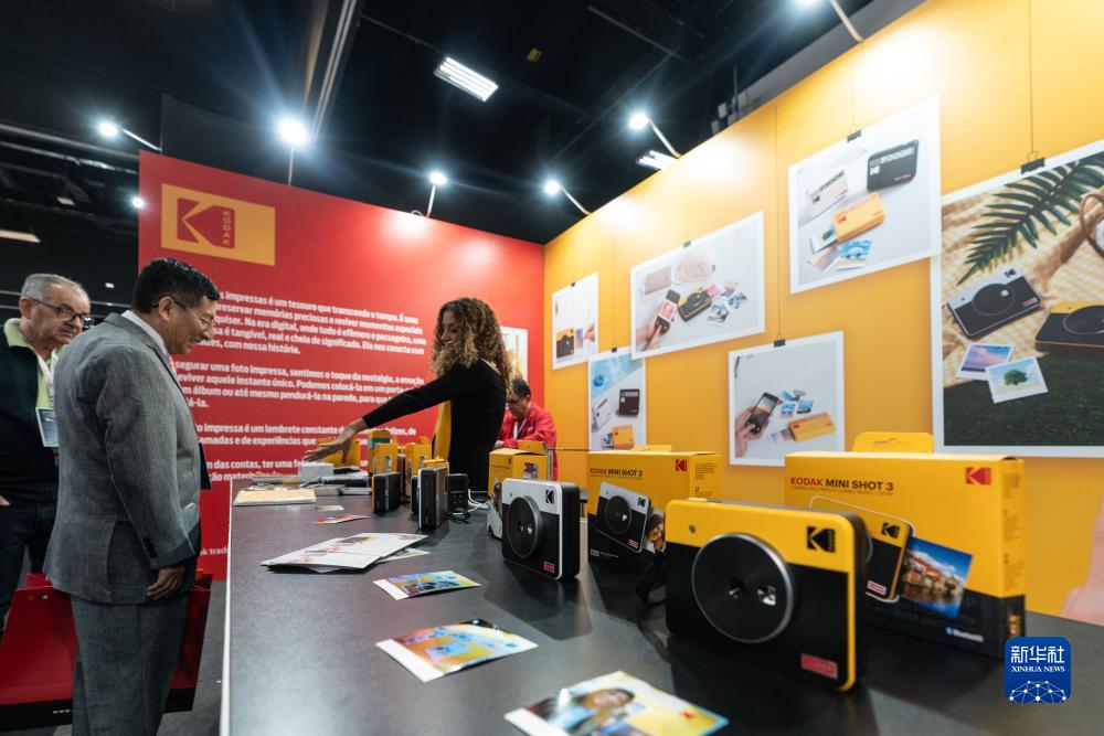 7月10日,在巴西圣保羅舉行的國際消費類電子及家用電器產(chǎn)品展覽會上,參觀者在柯達公司展臺了解即時成像相機。