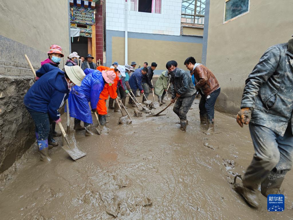 7月11日,在甘肅省甘南藏族自治州夏河縣麻當鎮,當地組織力量進行清淤。