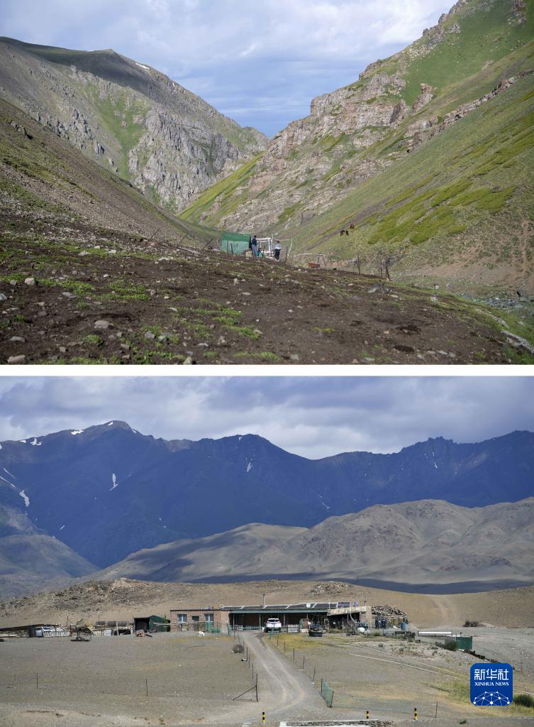 拼版照片:上圖為牧民哈布得拉什么在高山夏季牧場居住的帳篷搭建于巴爾魯克山深處(7月5日攝);下圖為哈布得拉什么一家在巴爾魯克山腳下常年居住的房子(7月6日攝)。