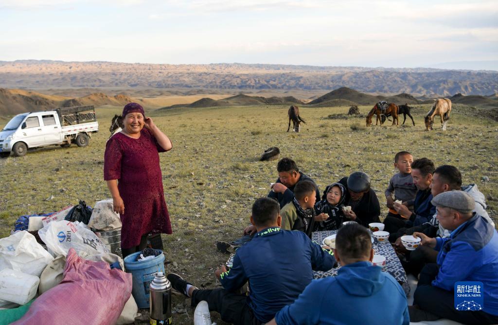 轉場隊伍抵達第一天的露宿營地后,巴哈提(左)帶著物品和當日晚餐如約趕到(7月3日攝)。