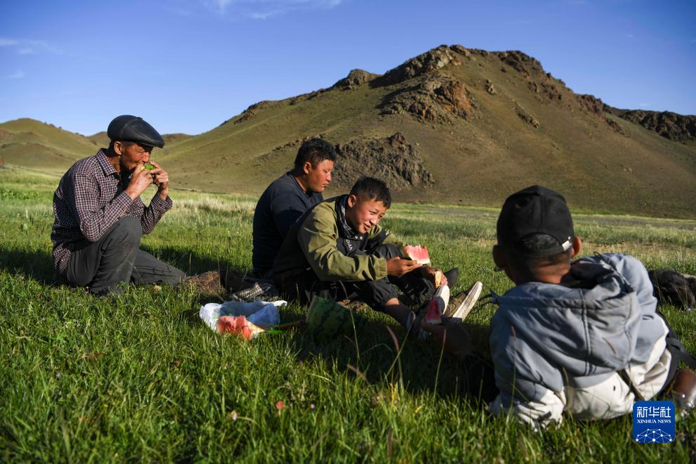 哈布得拉什么(左一)和他的弟弟朱馬爾(左二)、侄子寨桑(左三)、女婿阿依薩在轉(zhuǎn)場途中休息聊天(7月3日攝)。