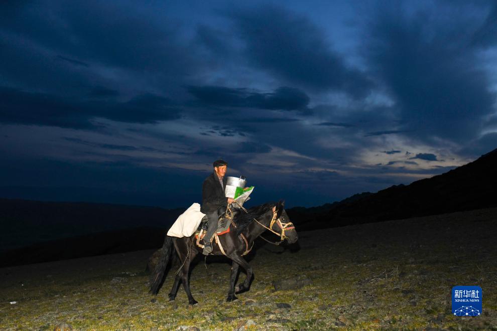 由于坡度太大,汽車無法攜帶物品抵達(dá)露宿營地,哈布得拉什么只好騎馬轉(zhuǎn)運(yùn)(7月3日攝)。