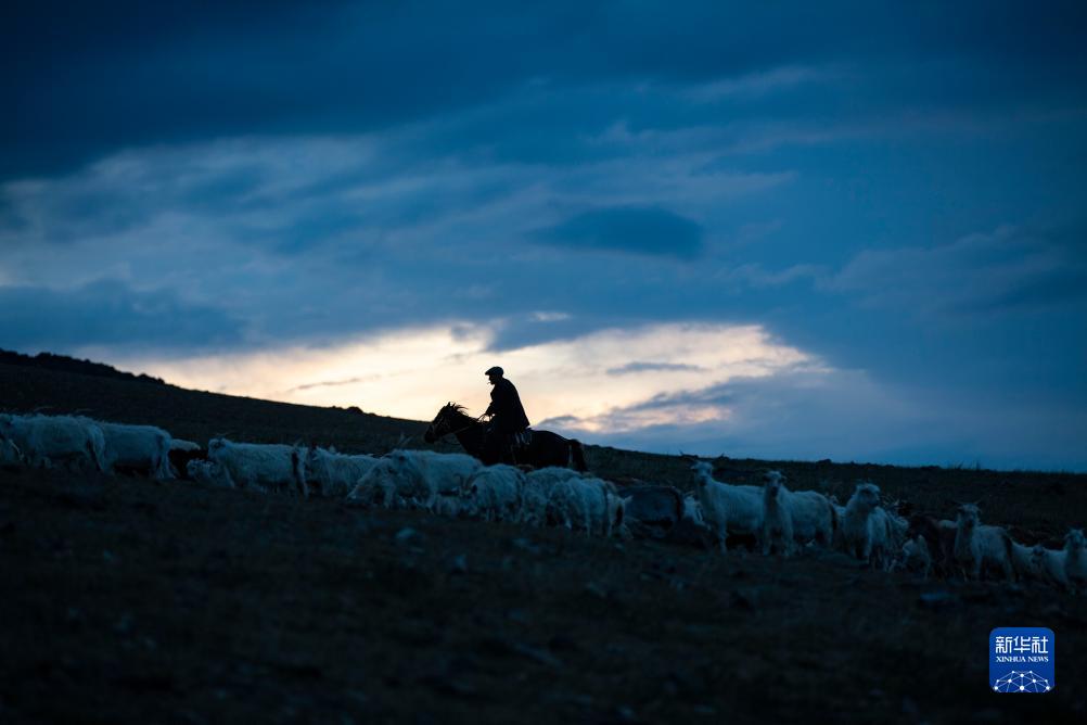 轉(zhuǎn)場第二天清晨,哈布得拉什么迎著霞光,騎馬清點羊的數(shù)量(7月4日攝)。