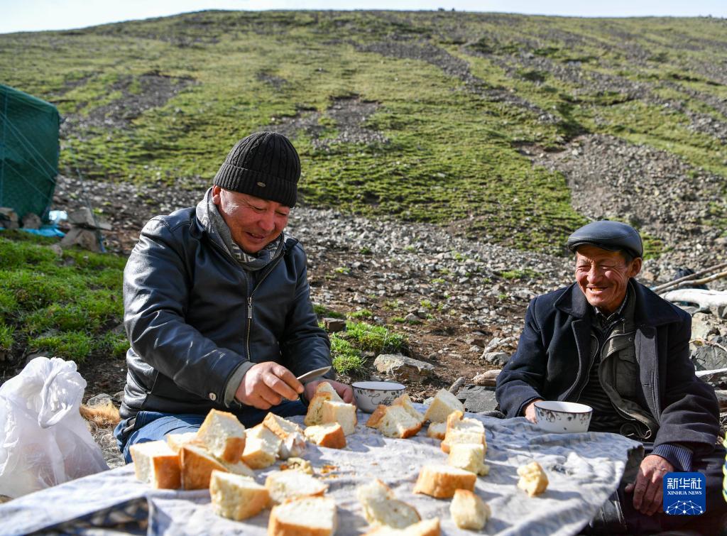 哈布得拉什么(右)在夏牧場上吃早餐(7月4日攝)。桌上的塔巴馕是妻子巴哈提提前在家中烤制好的。