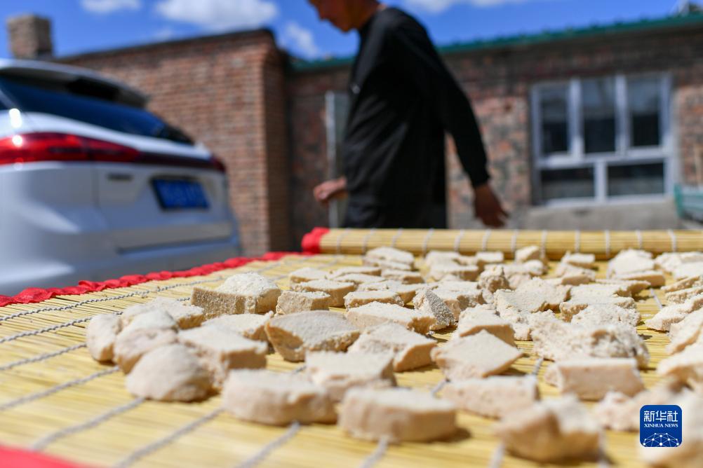 這是巴哈提在家制作的酸奶疙瘩,主要向過往游客出售,售價為每公斤100元(7月6日攝)。她家門口就是318省道,是新疆塔城地區一條熱門自駕游線路。