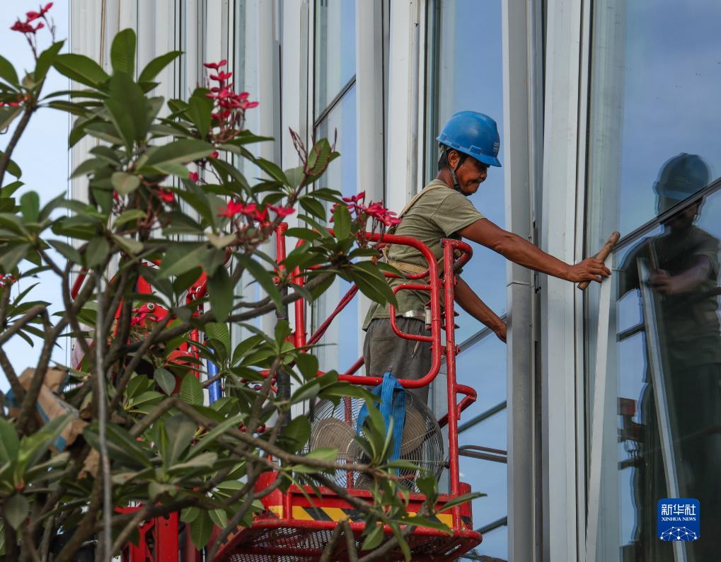 建設(shè)者在國(guó)際金融論壇(IFF)永久會(huì)址進(jìn)行幕墻施工(7月10日攝)。