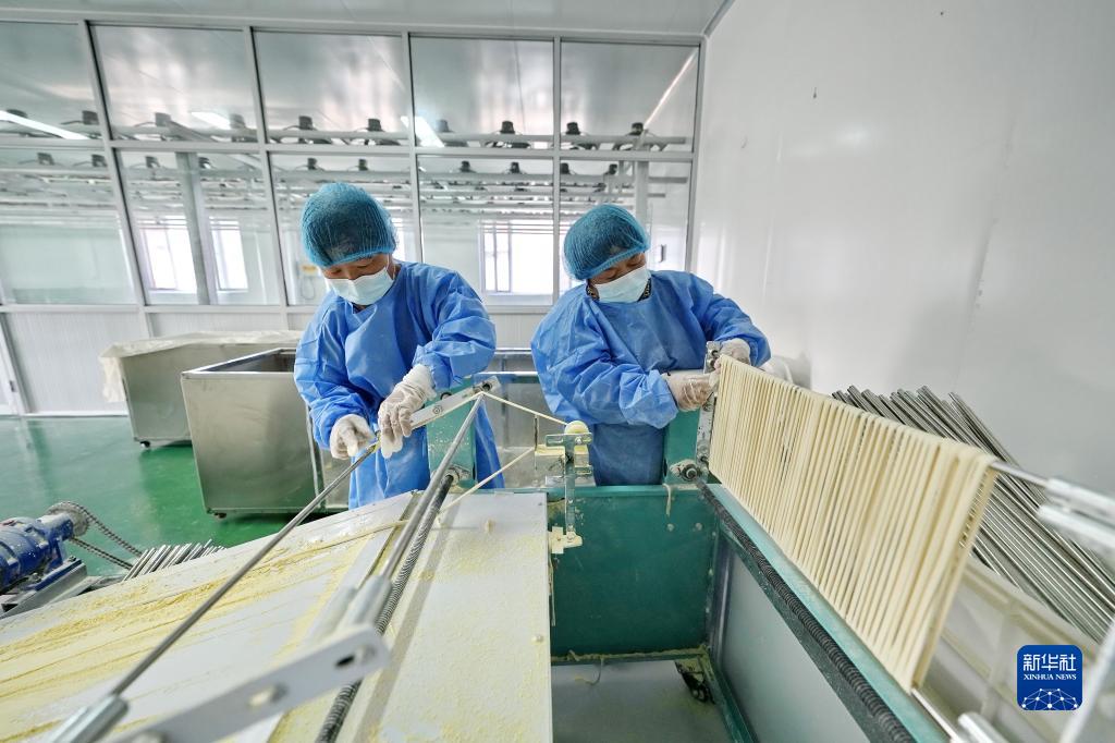7月11日,河北省遷安市野雞坨鎮丁莊子村一家食品生產企業的工人在空心掛面生產線上工作。