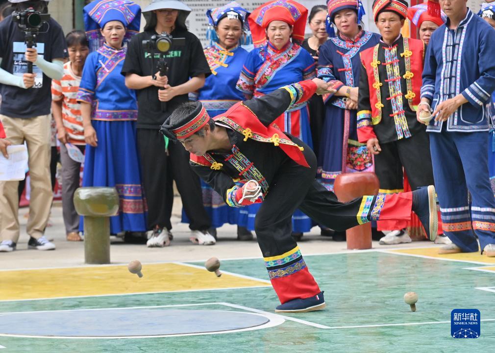 7月11日,在大化瑤族自治縣仁良村,村民在陀螺文化展演活動中打陀螺。