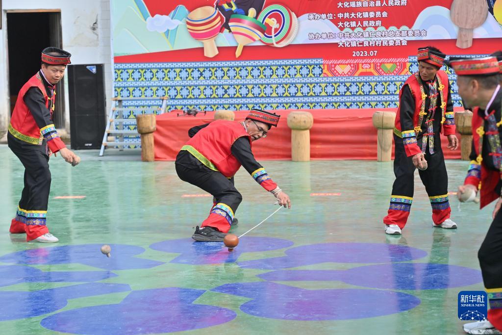 7月11日,在大化瑤族自治縣仁良村,村民在陀螺文化展演活動中打陀螺。