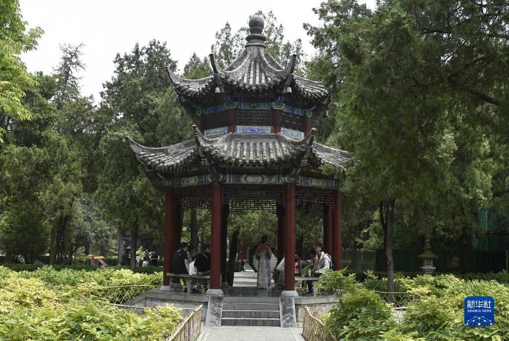 7月11日,游人在洛陽市白馬寺景區納涼休閑。