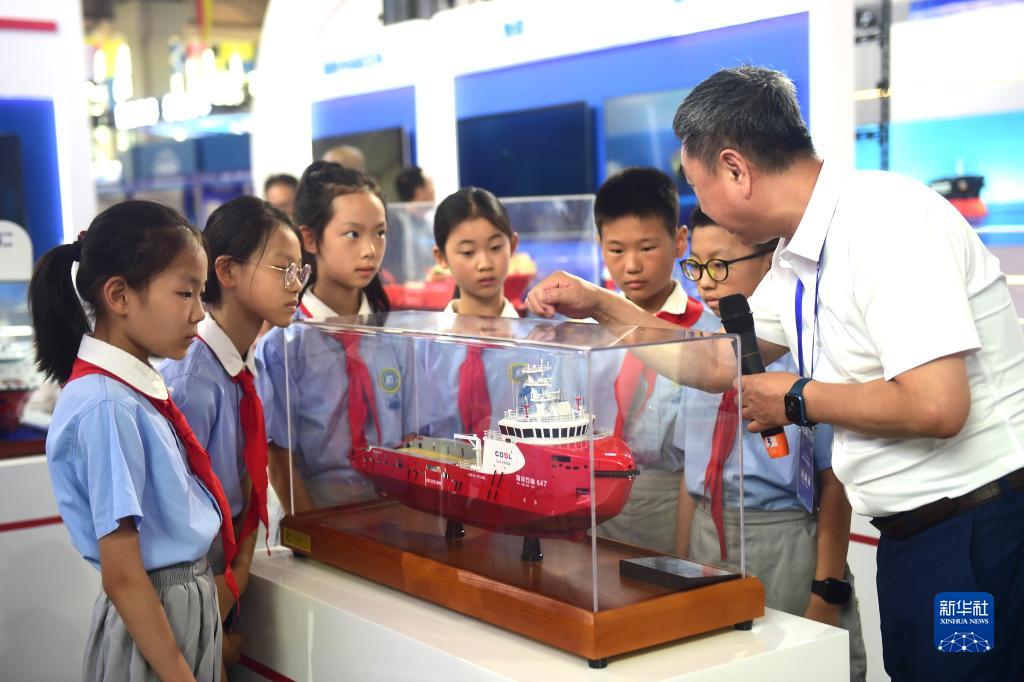 7月11日,滄州市實驗小學學生在2023年航海科技博覽會上了解中海油田服務股份有限公司的新型船舶。