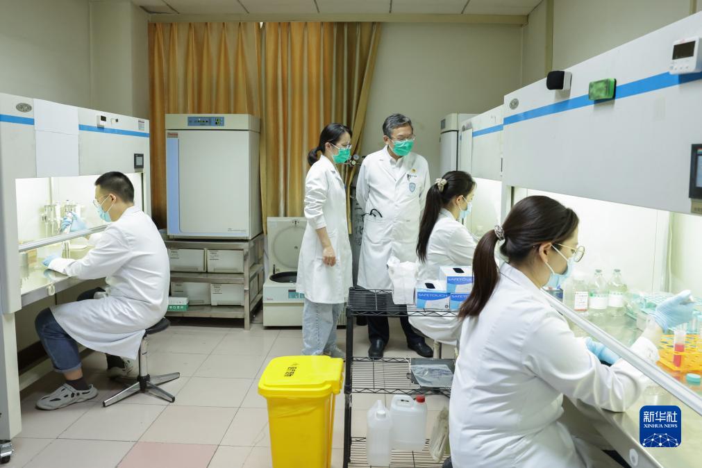 6月30日,黃曉軍(左三)在北京大學血液病研究所指導學生做實驗。