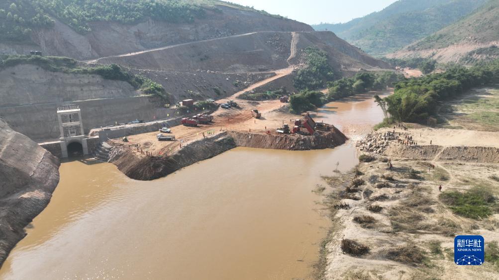 這是7月10日在盧旺達北方省加肯凱市拍攝的中企承建盧旺達那巴龍格河二號水電站項目截流現場(無人機照片)。